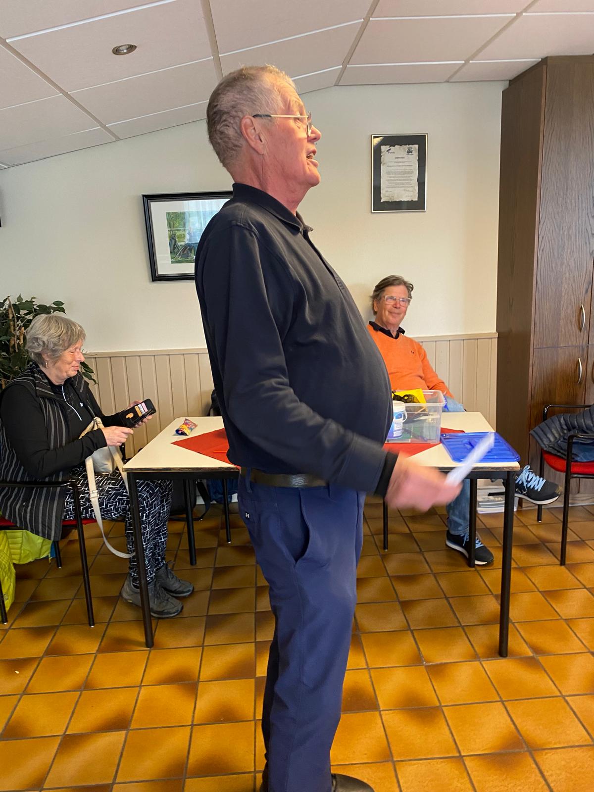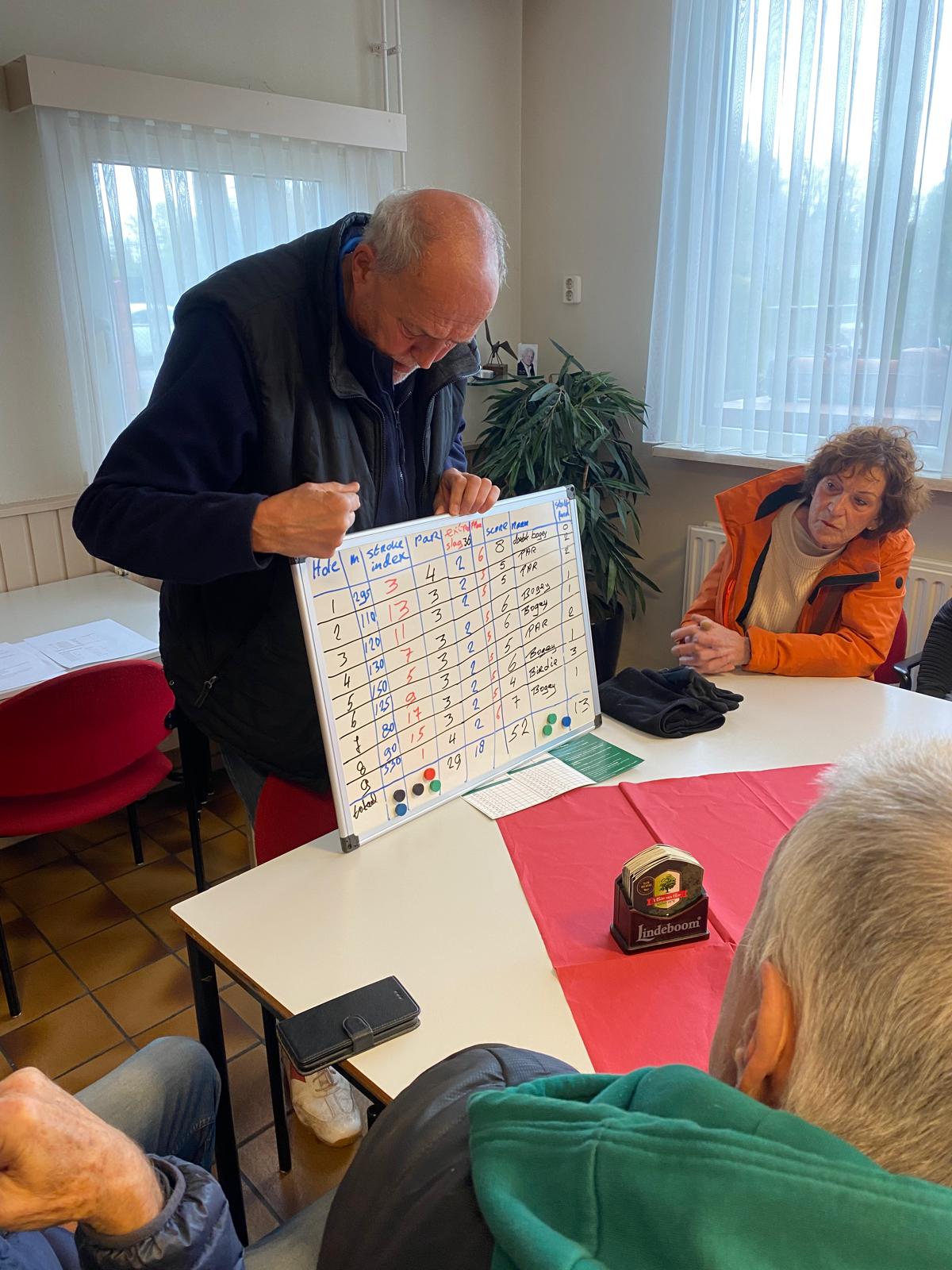 Ge Versleijen geeft voor de golfwedstrijd een uitleg over stableford.