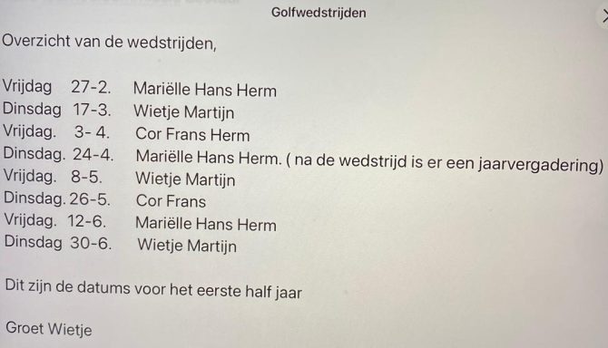 Een opmerking voor de volgende keer. Wanneer je op een par 3, 7 slagen heb gehad of op een Par 4 , 8 slagen en nog niet uitgeholed heb, dan moet je de bal oprapen en een 7 of 8 noteren en je mag geen hcp-slagen aftrekken. Maar heb je wel uitgeholed, met 7 op par3 of 8 op par 4, dan mag je natuurlijk wel de slagen aftrekken.